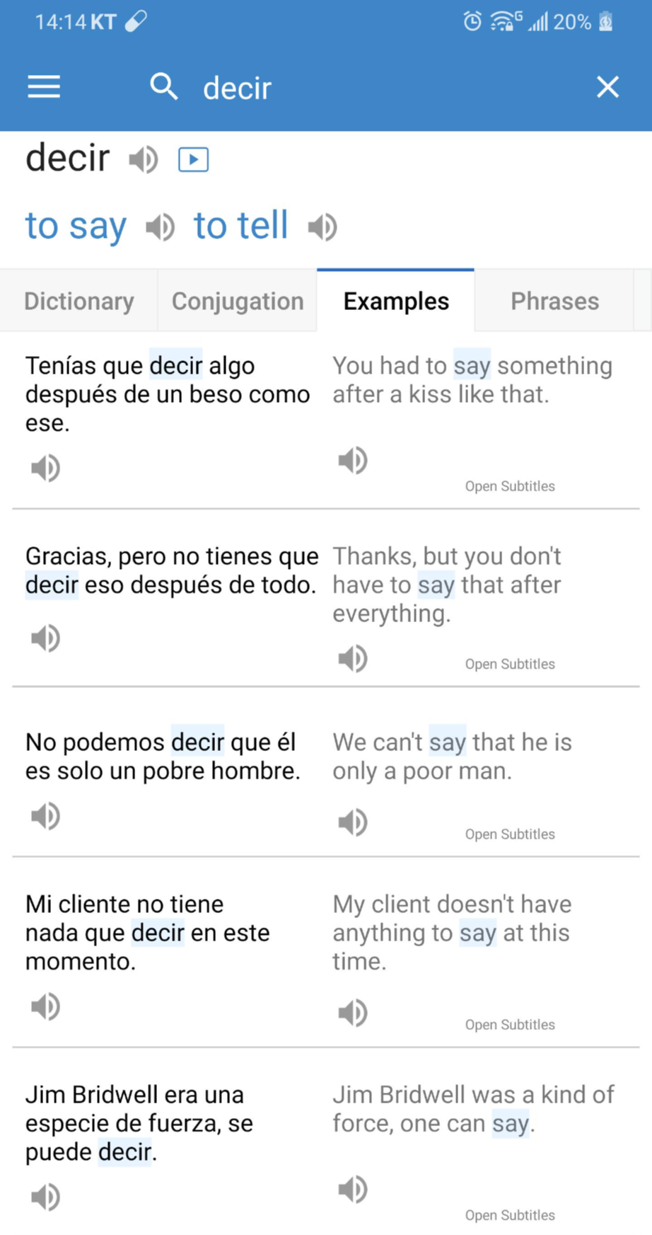 모르는 동사가 나올 때 구글 번역기를 돌려도 전체적인 동사변화는 찾을 수 없어서 답답했는데 이 앱에서는 현재형/과거형/ 또 다른 분사들 변형까지 한눈에 보여준다. 나처럼 이제 동사변형을 접하면서 멘붕이 온 사람들에게 아주 유용하다. 발음을 들어볼수 있고, 문장 예시 및 관용구도 따로 정리되어 있다.