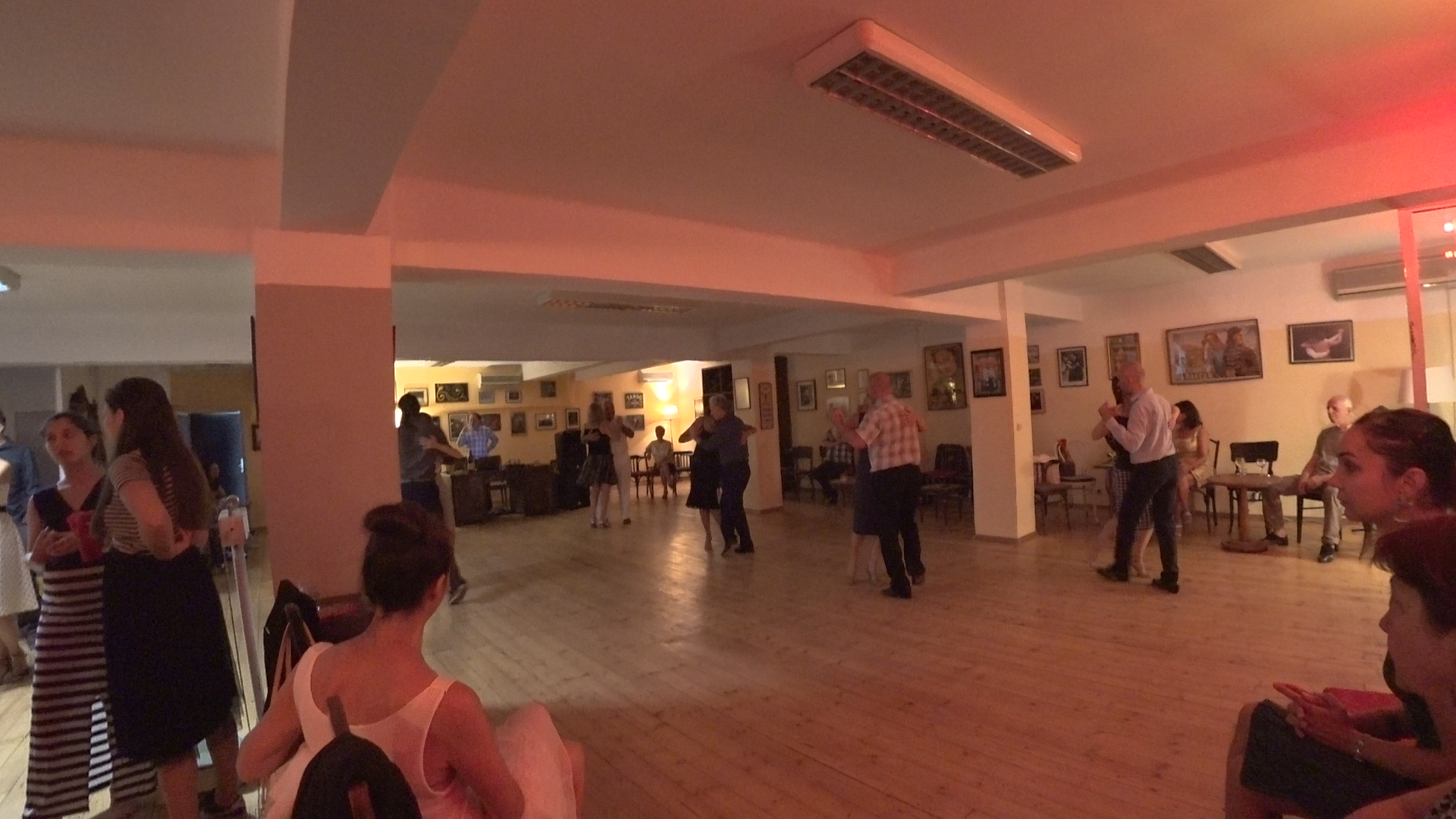 이곳 밀롱가와 서울의 밀롱가의 다른 점은 이 사람들은 춤을 열심히 (많이) 추지 않는다는 것이다. (유럽 대부분이 그랬다.) 대부분의 공간이 플로어로 구성된 우리 밀롱가들은 구조부터 사람들이 대화를 하고 즐길만한 공간이 충분하지 않다. 대표적으로 탱고 오나다를 보면, 플로어가 대부분을 차지하고 있어서 춤을 추지 않는 순간에는 서 있을 공간도 충분치 않다. 하지만 유럽의 밀롱가들은 대화의 공간이 많다고 할까? 이 곳도 절반이 플로어이고 절반가량이 소셜을 위한 공간이다. 여름방학을 막 마치고 돌아온 사람들은 춤보다 대화가 고팠나 보다. 모두 둘러 서서 이야기꽃 피우기에 여념이 없다. 낯선 이방인에다 사교력 제로인 나는 역시 대화에 툭 들어가기가 쉽지 않다. 우리 팀 소셜을 맡고 있는 남편도 역시 다리 부상으로 기량을 펼치지 못한다. 다리가 다쳤는데 왜 말을 못 해?라고 생각할 수 있는데 탱고판이 그렇다. 대화를 하다 보면 자연스럽게 춤을 같이 추는 경우가 많은데 그럴 수 없다는 게 대화까지 움츠러들게 한다. 게다가 우리는 이방인이잖아!